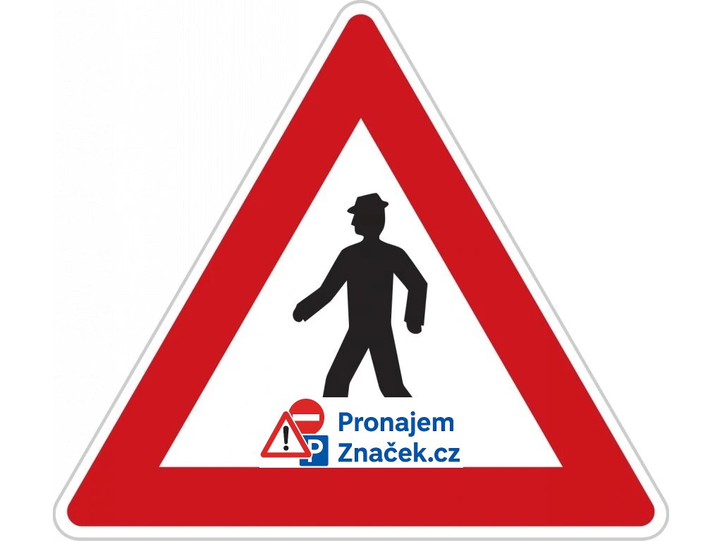 Dopravní značka A12a Chodci upozorňuje na místo pro přecházení nebo úsek pozemní komunikace se zvýšeným výskytem pohybu chodců po krajnici nebo okraji vozovky.